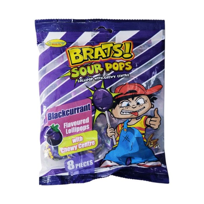 An 8-piece pack of Brats Sour Pops Blackcurrant lollipops with a bold blackcurrant flavour and sour kick, perfect for party packs, lunchbox treats, or resale, individually wrapped for freshness and ideal for both retail and wholesale buyers.