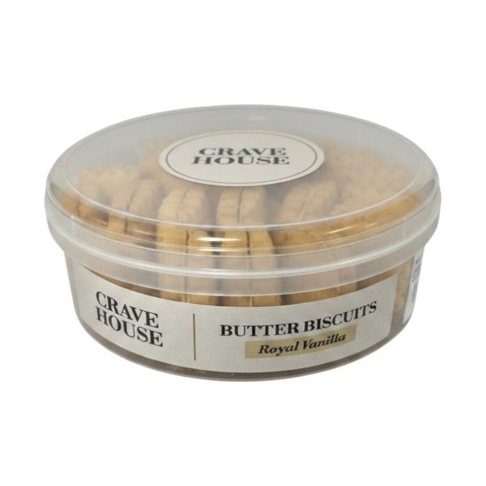 A 500g pack of Crave House Royal Vanilla Butter Biscuits featuring rich, buttery biscuits with a smooth vanilla flavour, perfect for tea-time, snacking, or sharing.