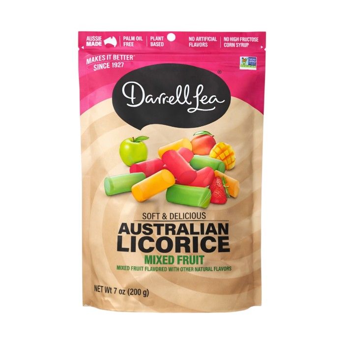 DARRELL LEA 200G MIXED LIQUORICE offers a selection of premium Australian liquorice, known for its soft, chewy texture and rich taste. With a mix of classic and exciting new flavours, this assortment is perfect for liquorice enthusiasts. The resealable pack keeps the liquorice fresh for longer, making it a convenient treat for on-the-go snacking or sharing. Sweet Depot provides this product for both retail and bulk buyers.