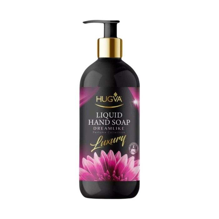 A 500ml bottle of Hugva Dream Like Hand Soap with a soft, long-lasting fragrance, perfect for everyday hand cleansing, conveniently bottled with a pump dispenser and ideal for both retail and wholesale buyers.