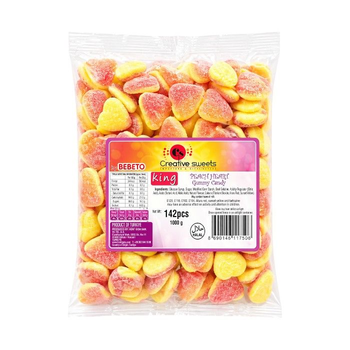 King Jelly Peach Hearts (1kg) offer a delicious assortment of soft and chewy gummy sweets shaped like hearts and bursting with a juicy peach flavour. Each piece delivers a perfect balance of sweetness and a light tangy finish, often coated in fine sugar for added texture and taste. These gummies are perfect for party packs, candy tables, themed events, or everyday snacking, appealing to both kids and adults. The generous 1kg bulk pack provides excellent value for families, retailers, and event planners looking for a popular and fast-moving confectionery option. Carefully packed to maintain freshness and quality, they are ideal for both home use and retail display. Sweet Depot supplies King Jelly Peach Hearts at competitive wholesale and retail pricing, ensuring excellent value and reliable availability for both individual customers and business buyers.