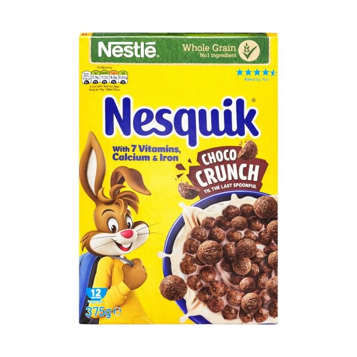 A 375g box of Nesquik Chocolate Crunch cereal featuring crunchy chocolate-flavoured cereal pieces, perfect for breakfast or snacks, conveniently packed and ideal for both retail and wholesale buyers.