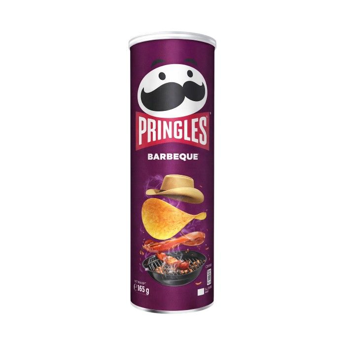 A flavour-packed 165g can of Pringles BBQ crisps with a smoky and sweet barbecue taste, perfect for sharing, parties, or everyday snacking, conveniently sealed for freshness and ideal for both retail and wholesale buyers.