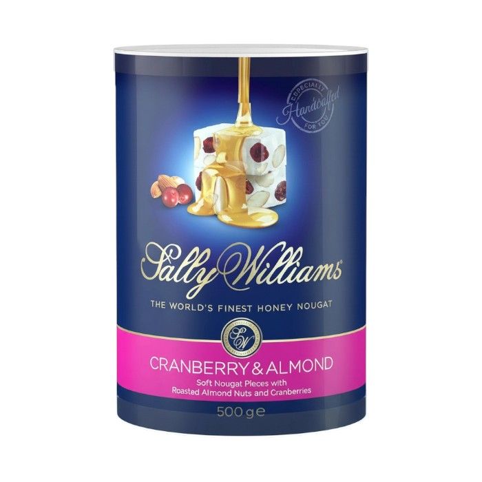 Enjoy the luxurious taste of Sally Williams 500g Cranberry & Almond, a premium handcrafted nougat made with the finest ingredients. Each piece combines creamy, melt-in-your-mouth nougat with crunchy almonds and real tangy cranberries, offering a perfect balance of sweetness and texture.