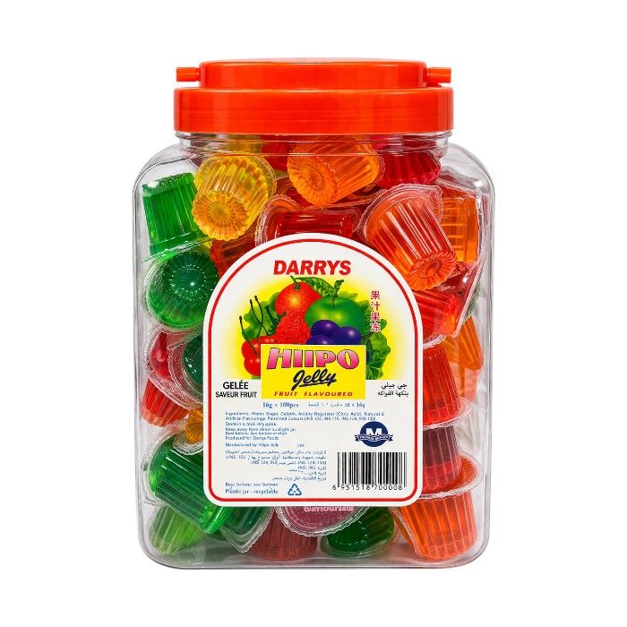 Darrys Hiipo Jelly (100s Tub) delivers a playful mix of fruity, bite-sized jelly treats in a convenient and colourful tub. Each cup is filled with sweet, smooth jelly in flavours like strawberry, pineapple, and grape—perfect for kids and nostalgic adults alike. The 16g mini cups are individually sealed to ensure hygiene and freshness, making them ideal for school lunchboxes, party packs, or snack tables. With 100 units in one sturdy, reusable container, this bulk pack offers exceptional value and variety. Available now at Sweet Depot, with competitive pricing for both retail customers and wholesale buyers looking to stock up on a kid-friendly classic.