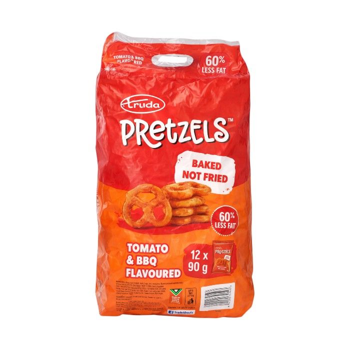 A 90g pack of Truda Pretzels Tomato & BBQ featuring crunchy pretzels with a tangy tomato and smoky BBQ flavour, perfect for snacking, sharing, or lunchboxes, conveniently packed and ideal for both retail and wholesale buyers.