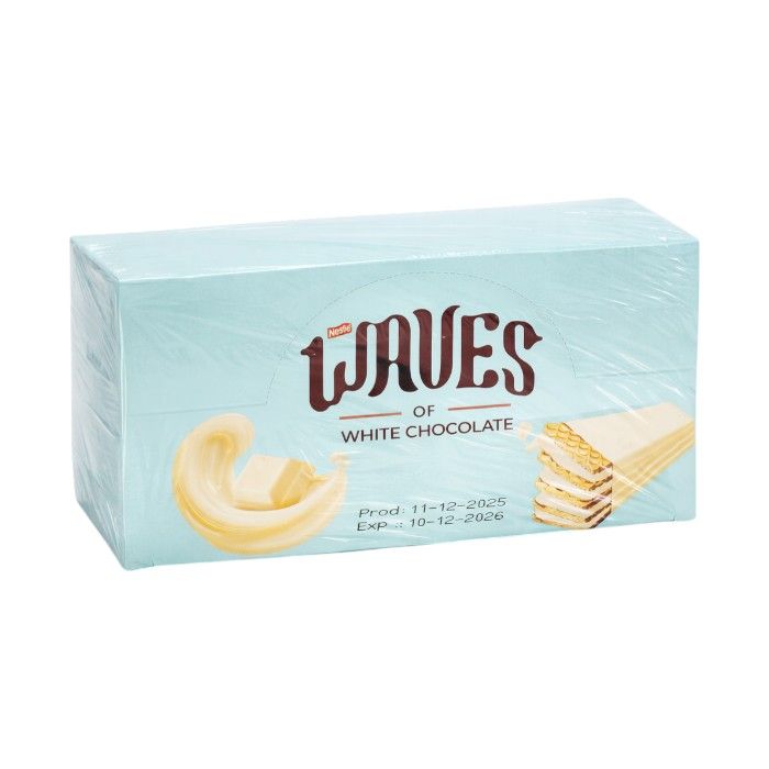 A tasty 40g Waves White Chocolate Wafer featuring crispy wafer layers filled with smooth white chocolate cream, perfect for on-the-go snacking or lunchbox treat
